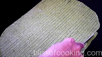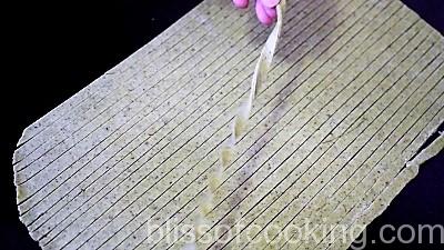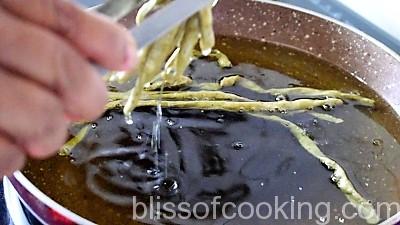 - Divide the dough into 2 portions. Roll 1 part into a big circle of about 1/5 inch thickness. Cut into 1/3 inch wide stripes. Twist them a little and fry them in small batches over medium to low heat until they are crisp.
