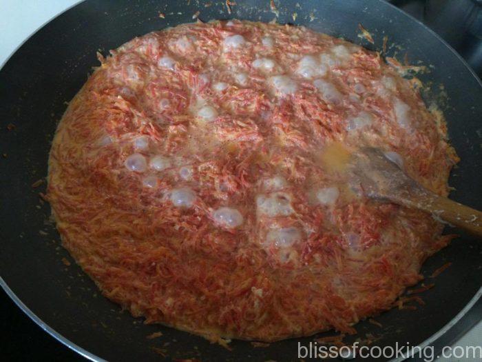 - Add the grated carrot and boil till all the milk has evaporated. Stir the halwa once in a while so that it does not stick at the bottom.