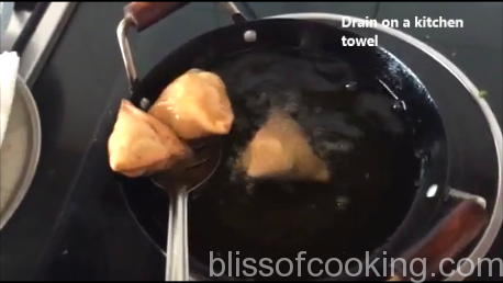 - Gently slide the samosa one by one and fry on medium to low heat till golden, by turning continuously so as to get uniform golden colour.