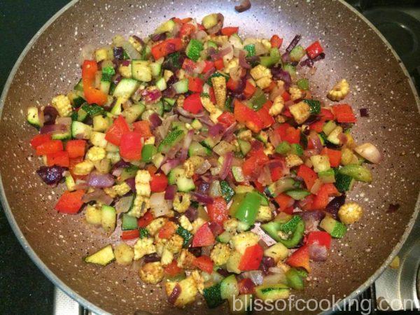 - Heat oil in a pan; add garlic, onion, red yellow capsicum and zucchini.