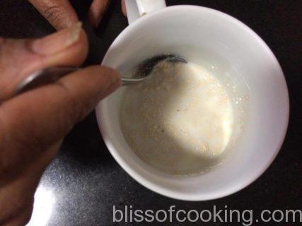 • In a mixing bowl mix together lukewarm milk, yeast and sugar and keep aside for 10 minutes to froth the yeast.