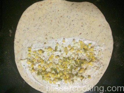 • Spread the mayonnaise on half the rolled dough like semi-circle, then the corn followed by jalapeno and cheese. Season with dried herbs.