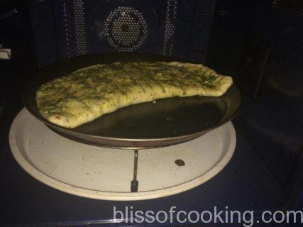 • Transfer to the baking tray, mark into strips with the help of a pizza cutter taking care not to slit deep down otherwise the cheese will ooze out while baking.