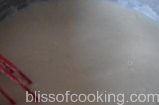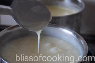 • Reduce the heat to low and boil for 5 to 7 minutes or till the milk is thick enough to coat the back of the spoon.