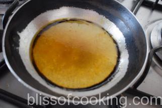• Heat a dry non-stick pan. When hot, sprinkle the sugar over the pan. Reduce flame to low heat and wait while the sugar starts to melt and turns a light golden brown.