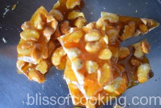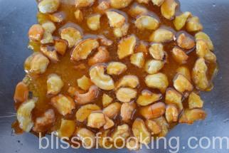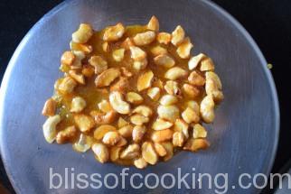 • Remove from fire as soon as the colour changes to dark golden brown and the cashew nuts look roasted, tip immediately into a plate lined with parchment or butter paper and let it cool completely.