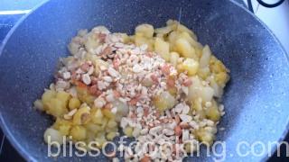 • Heat ghee in a pan; add the green challis and then potatoes and saute for 5 minutes.