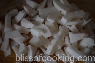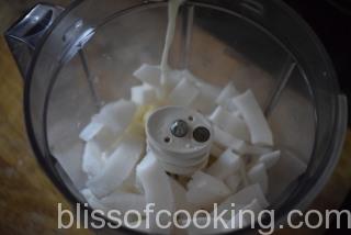 - In the meantime peel the coconut to remove the brown thin peel so that you get just the white flesh. Slice and grind the coconut by adding milk which we have kept aside.