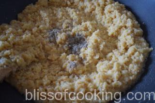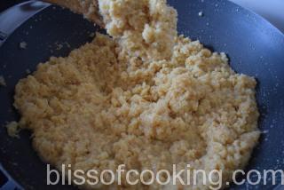 - Keep on stirring till the sugar syrup thickens and the coconut mixture leaves the sides. Switch off the heat and add cardamom, mix.