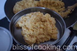 - Grease a tray or a plate with ghee, pour the coconut mixture and level it.