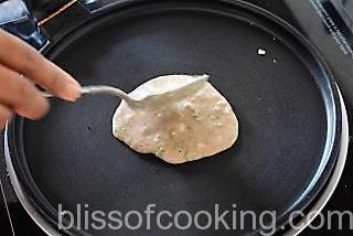 - Heat a good nonstick tava (skillet) and pour 2 tablespoon of the batter in the middle and spread it by the back of the spoon in a circular movement just like dosa.