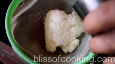 - Strain and wash the paneer under tap water to remove the sourness. Keep it under light weight for 20 minutes to drain excess water.