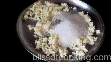 - Place the paneer in a plate and mash it well with the end of your palm for 2 minutes.