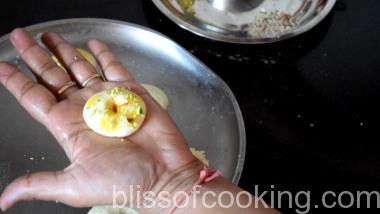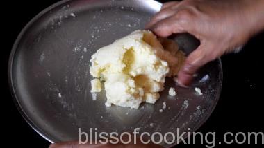 - Divide the chenna into 10 to12 portions and roll to shape like balls and then slightly flatten them.
