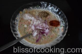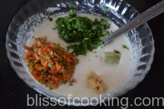 - Add the vegetables, onion, coriander, ginger, garlic and mix well.