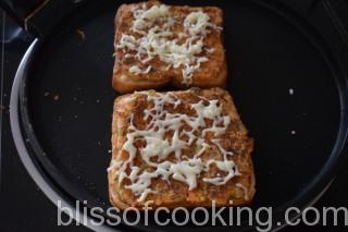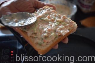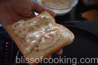 - Apply 2 to 3 tablespoon of the sooji batter on one side of the bread slice and place on the hot skillet, batter side down.