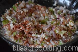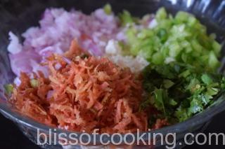 - In a large bowl add paneer, onions, capsicums, carrot and mix.
