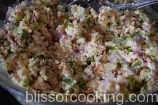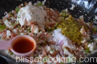 The stuffing is flavoured with mustard sauce and Tabasco. The mustard sauce I have used is known as Kasundi, which is Indian mustard sauce from state of Bengal.