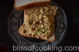 - Spread a thick layer of this mixture on a bread slice and place another slice on top.