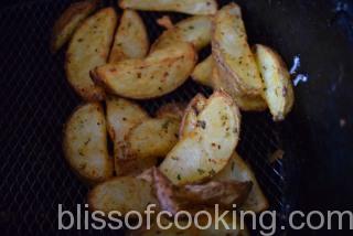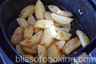 • Transfer in a preheated air fryer and air fry for 10 minutes and then sprinkle some more of the spice mix and again air fry for 5 minutes.