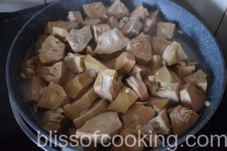 - Chop the kathal in ½” thick slices. Boil for 10 minutes until cooked.