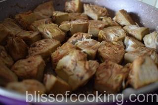 - Heat 1 tablespoon oil in a nonstick pan; saute the kathal for 5 minutes or till colour changes. You can deep fry them also. Set aside.