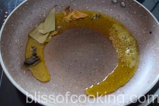 - In the same pan add rest of oil; add jeera, mace, cardamom, cloves and bay leaves.