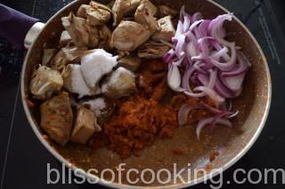 - Add the sliced onion, Kathal, salt and mix well.