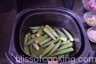 This rich gravy is made without using much oil unlike the traditional recipes where okra is fried and then added to the gravy. I have air fried the okra and trust me there is no compromise on the taste. This tastes even better without too much of oil.