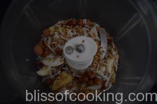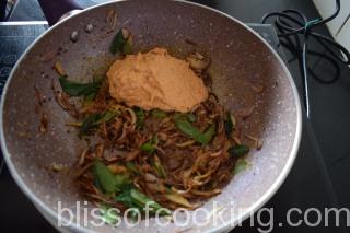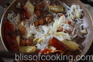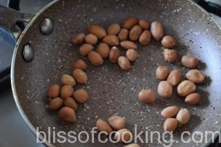 - In a pan; dry roast peanut, til, coconut and red chilli, till fragrant. Add the garlic and ginger and make a fine paste by adding little water, set aside.