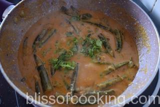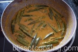- Add the jaggery, tamarind paste, bhindi and cook for 8 to 10 minutes. By this time the curry will be smooth and thick.