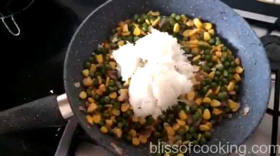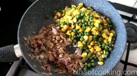 - Now add the corn, peas and saute.