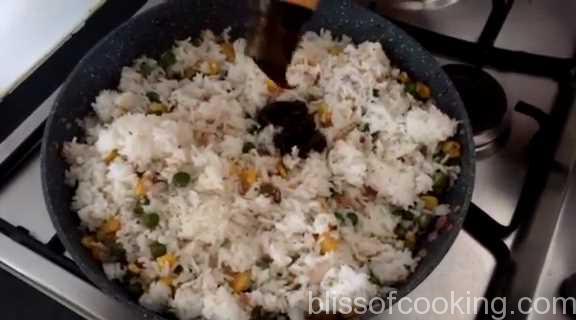 - Add the rice, salt, pepper, and oyster sauce.