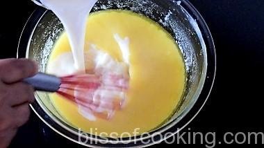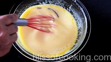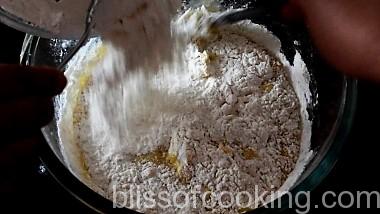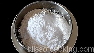 - Mix together flour, sugar, baking powder and sift (pass through a sieve) for 6 to 8 times and set aside.