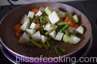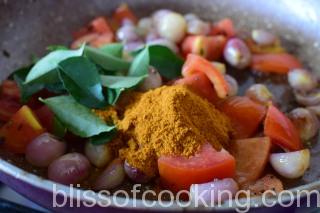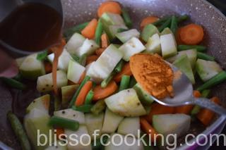 • Heat 1 teaspoon oil in a pan; add the vegetables, 1 teaspoon sambar masala, tamarind pulp, salt and saute for 2 to 3 minutes.