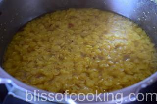• Boil tuvar dal, salt, haldi and water in a pressure cooker for 10 minutes.