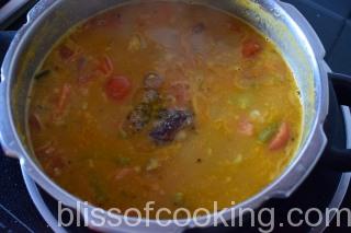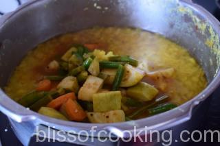 - Once the steam is realised from the cooker open the lid and add the vegetables to the dal. Mix and again close the lid. Boil for 5 to 7 minutes.