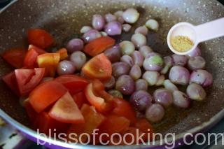 • Add the shallots, saute for 2 minutes and add the tomatoes, saute for 2 more minutes.