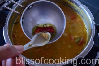 • For the tempering heat ghee in a small pan, add mustard, red chilli and let it splutter. Pour the tempering on the sambar.