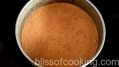 - Press the mixture onto the bottom of the spring-form pan making sure that the crumbs are compact. Press with the back of a tumbler.