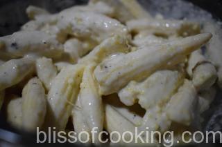- Transfer the baby corn in the batter and stir to coat all the corns well.
