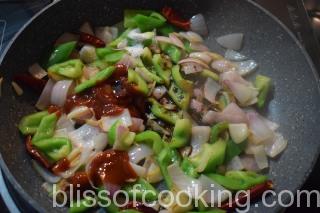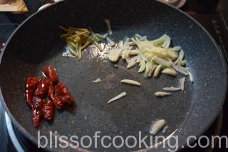 - Heat a pan; add the red chilli, garlic, half the ginger and saute for a minute.