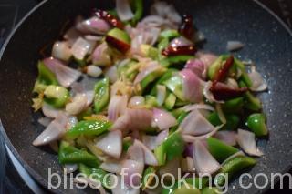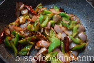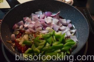 - Add the onions, capsicum and saute on high heat for 2 to 3 minutes.