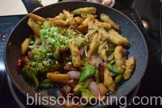 - Add the spring onions, rest of the ginger and fried baby corn and stir to coat well.