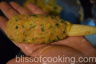 - Now take a hand full of the mixture and place a baby corn in between and close to form a lollipop.