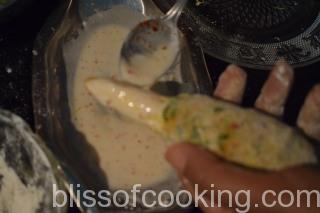 Note: Coating of the baby corn stem is done to flavor it and also to prevent the baby corn from becoming dark while frying.