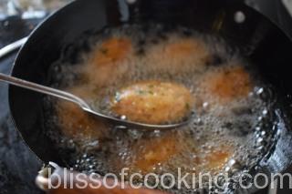 - Heat oil and fry them in batches on medium to low heat to golden brown.