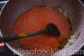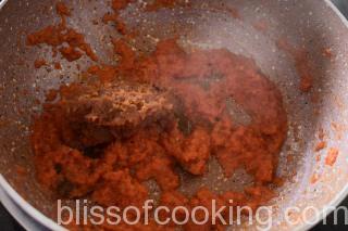 - Add the ginger, garlic,tomato puree and saute till thickens.