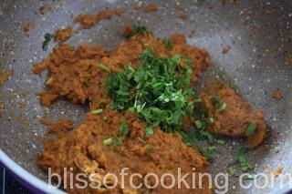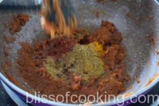 - Add haldi, chilli, coriander and saute for 2 minutes.