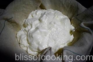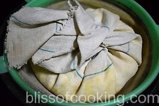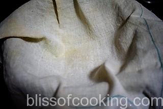 - Tie the yogurt in a muslin cloth and hang it overnight over a bowl, in refrigerator, so as to drain all the water from the yogurt.